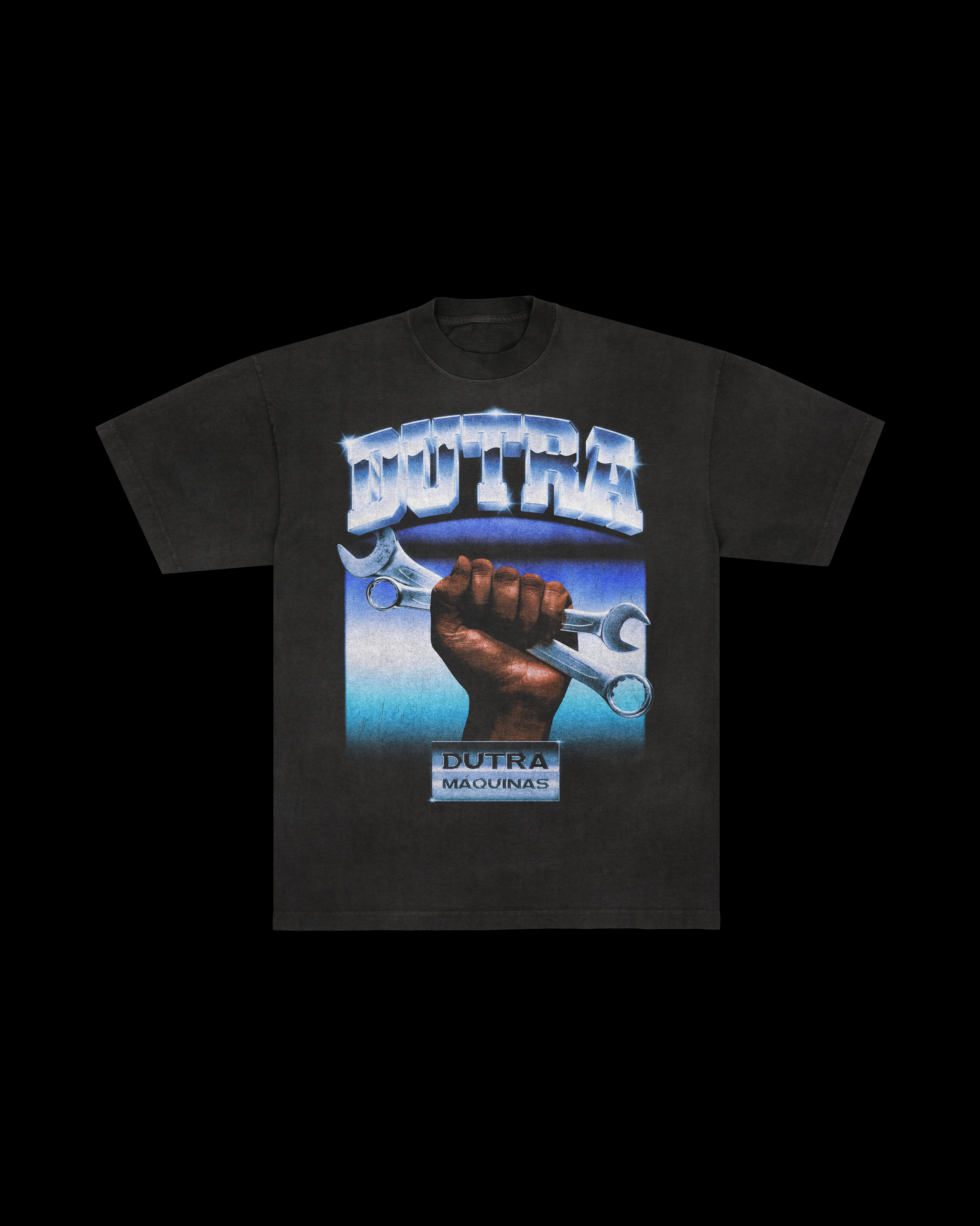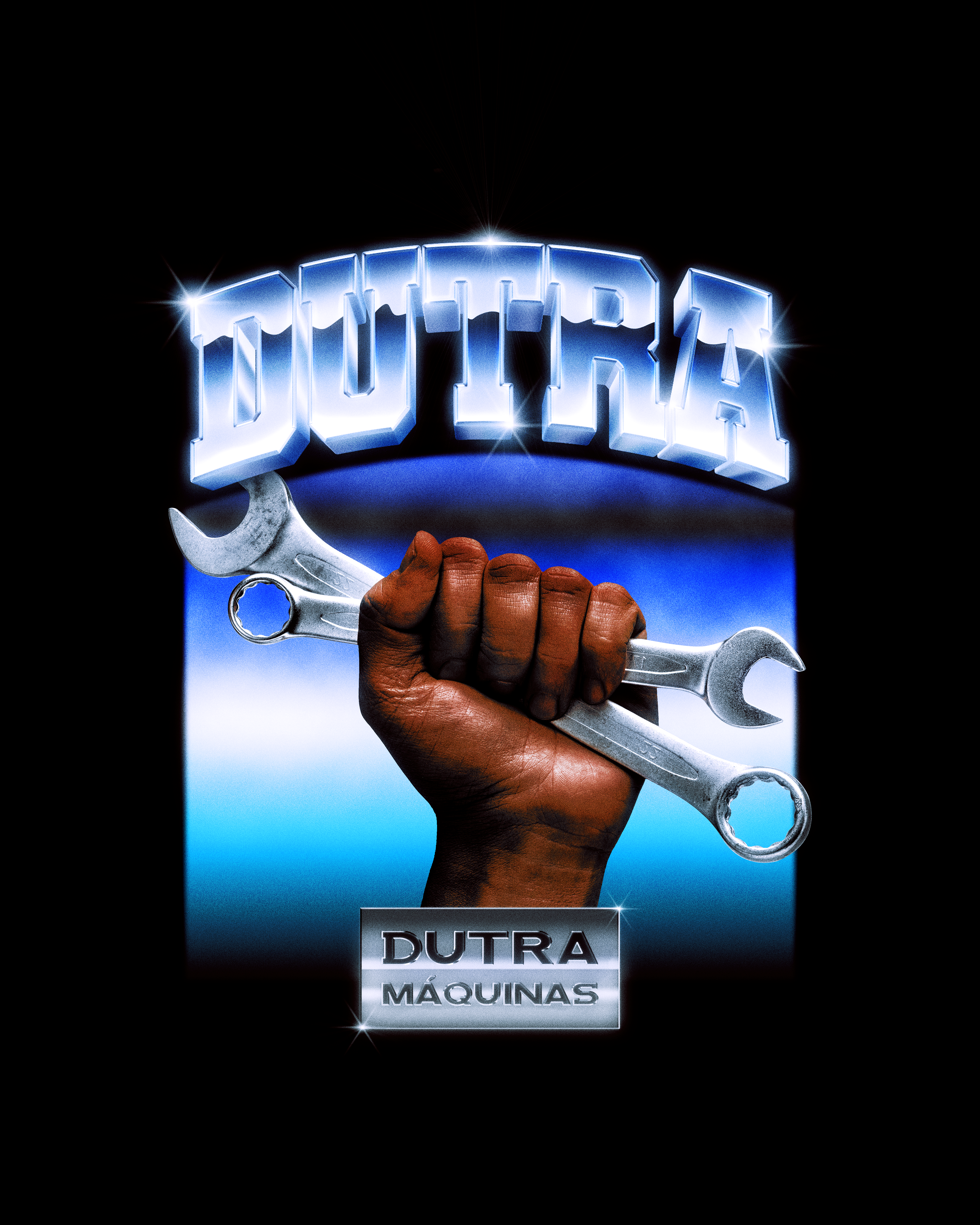Desenvolvimento de estampa para camiseta em estilo retro/vintage futurista para a empresa Dutra Máquinas, explorando referências gráficas e cromáticas da estética dos anos 80. A composição utiliza tipografia metálica com brilho, degradês em azul e contraste marcante, remetendo a cartazes e capas da época. Ao centro, um punho erguendo chaves, reforçando e traduzindo a identidade da Dutra Máquinas
